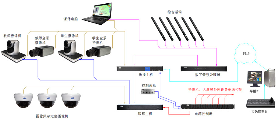 主要設備包括:錄播主機,圖像跟蹤主機,數字音頻處理器,高清云臺攝像機*2,高清全景攝像機*2,圖像跟蹤定位攝像機*3,拾音話筒*6,中控面板,電源控制器,切換控制臺。