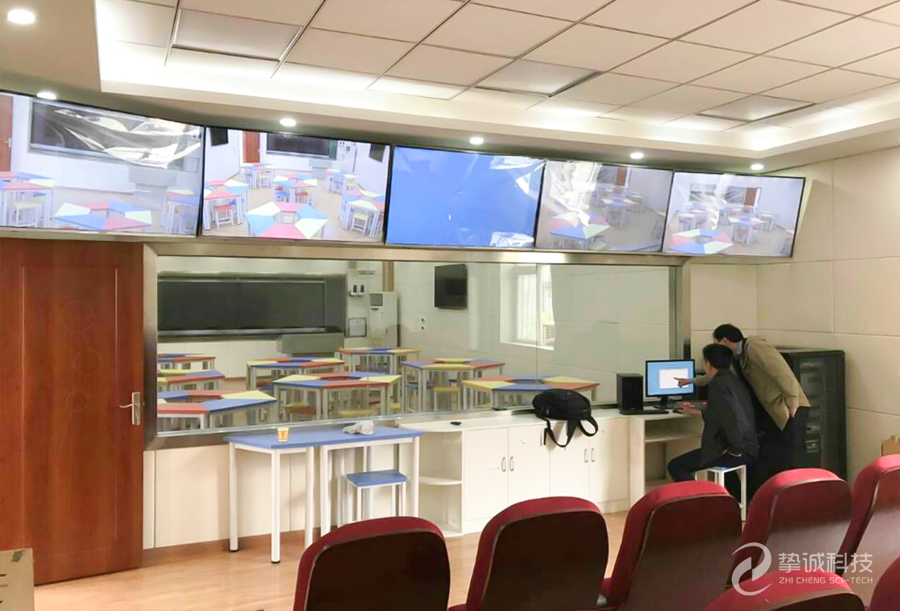 在觀摩室中可以實時觀摩監控老師上課的情況;也可以管理錄播設備,讓管理員幫助老師遠程導課。一般管理控制室的空間大小為8×3米,在管理控制中心的正面可以并排布置4張1.2m×0.5m×1m的長方形桌子。觀摩室內可放置一臺電腦遠程導播,再放置一臺觸摸一體機以觀看實時直播畫面。另外在管理控制中心的左側可以安放一個32U的機柜,將整個錄播課室的設備全部安裝在機柜中,方便管理和維護。