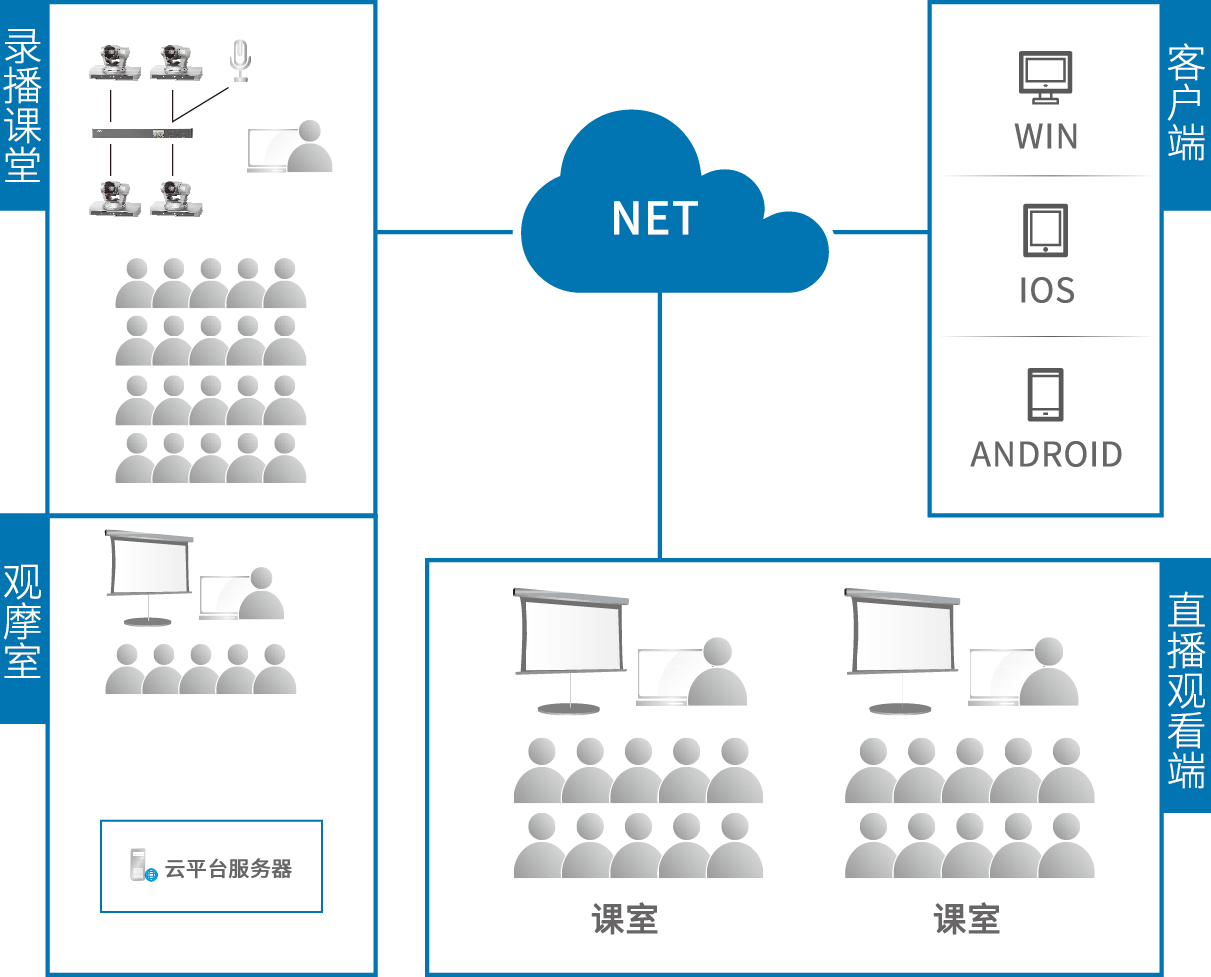 3.建設觀摩室。有別于傳統觀摩室僅實現課堂的觀摩功能,本觀摩室將平臺管理職能、實時導播職能于一體,是本方案產品的集中管理中心。