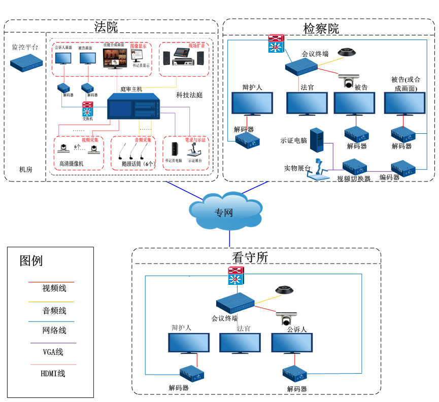 建設需求:利用先進的多媒體技術、集中控制技術、視頻會議技術以及計算機網絡技術,集中控制和管理遠程提訊/庭審的視頻采集、發言、視頻顯示、遠程作證、遠程審判、證據展示、筆錄速錄、庭審直播等遠程庭審應用,給看守所、檢察院、法院建設1套遠程庭審(提訊)室,所有的遠程庭審(提訊)資料存儲在法院庭審后臺存儲服務器。要達到: