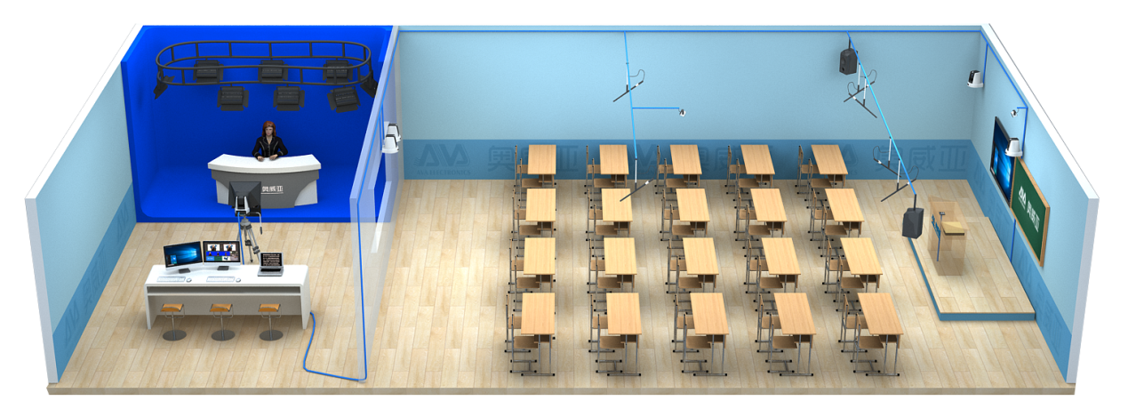 錄播主機部署在觀摩室,錄播主機同時具備藍綠摳像與動靜態背景疊加實時渲染輸出的功能,一臺主機實現標準錄播和校園電視臺兩個場景的應用,無需額外增加虛擬演播主機和摳像設備。