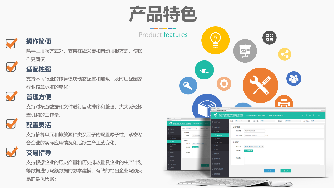 在開(kāi)發(fā)省級(jí)上報(bào)平臺(tái)的同時(shí),我們有針對(duì)性的開(kāi)發(fā)了園區(qū)版本、公建版本和控排企業(yè)的行業(yè)版本。旨在幫助企業(yè)有序進(jìn)行碳資產(chǎn)管理、有效降低減排成本,在碳交易過(guò)程中實(shí)現(xiàn)收益最大化。